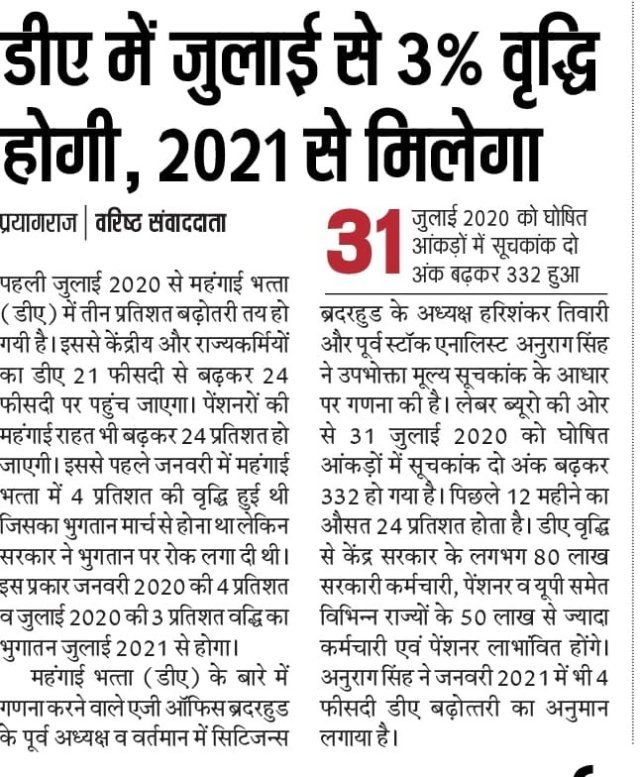 लेबर ब्यूरो द्वारा 31 जुलाई 2020 को घोषित आंकड़ो में सूचकांक दो अंक बढ़कर 332 अंक हो गया है । जिससे जुलाई 2020 में डी ए तीन फीसदी बढ़ना निश्चित हो गया है ।