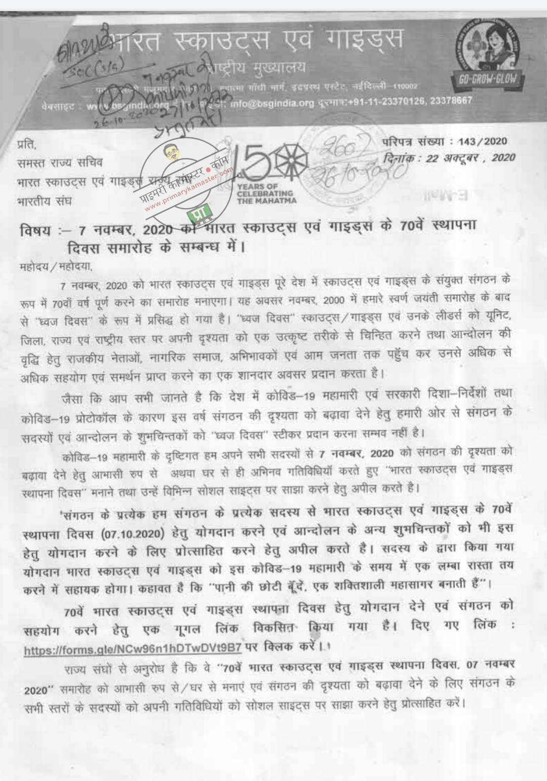 Secondary Education 07 नवम्बर 2020 को भारत स्काउट्स एवं गाइड्स के 70वें स्थापना दिवस समारोह के सम्बन्ध में admin02/11/202002/11/2020